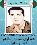بوتخمة ( فج الحراث) بعد بلاغ عن وجود دورية لجيش التحرير في جبل بوتخمة قادمة من تونس. حاصر الجيش الاستعماري 6 مجاهدين: العايش محمد أمازيان ، فروج طاهر ، العايش طاهر بن بركان ، فراحتية العيد ، بازويش ، طبيب عثمان. استشهد 3 مجاهدين : طبيب عثمان العايش الطاهر بن بركان قتلته الطائرة فراحتية العيد قتلته النصف المحمولة يوما بعد تجنيده ولم يكن مسلحا, أما المجاهد العايش محمد أمازيان فقد جرح ثم تمكن من مغادرة الجبل باتجاه السهل حيث قام بعض المدنيين بإسعافه. المجد والخلود لشهدائنا الأبرار |