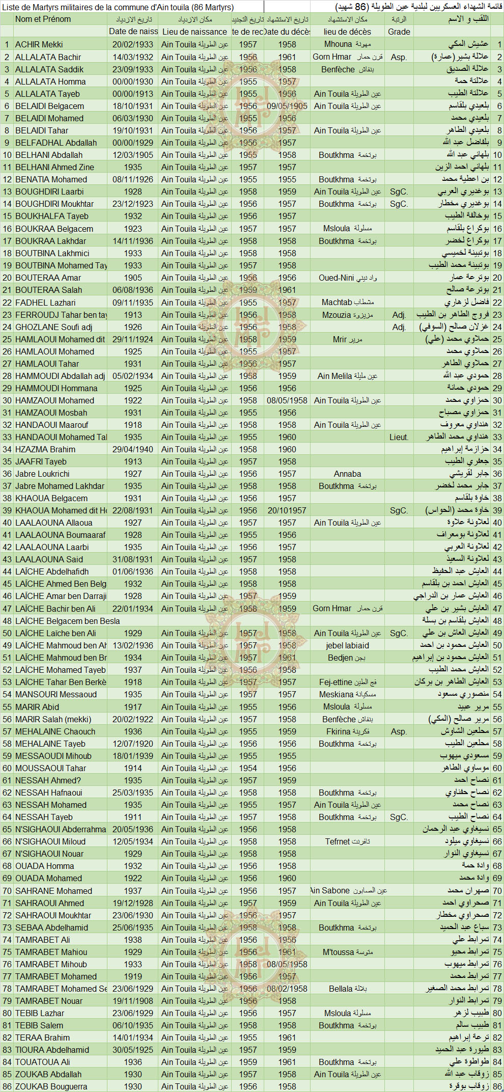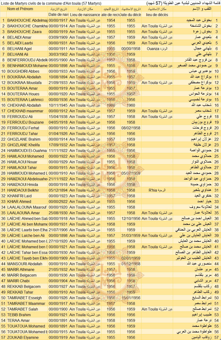 1961 : مواجهة بجران بعد تبليغ الجيش الفرنسي عن وجود مقاتلين اثنين في بدجران جنوب شرقي عين طويلة .،حاصر الجيش الاستعماري المقاتلين العايش محمود والعايش بلقاسم. بعد تبادل إطلاق النار قتل المجاهدان بقنبلة يدوية. المجد والخلود لشهدائنا الأبرار. |