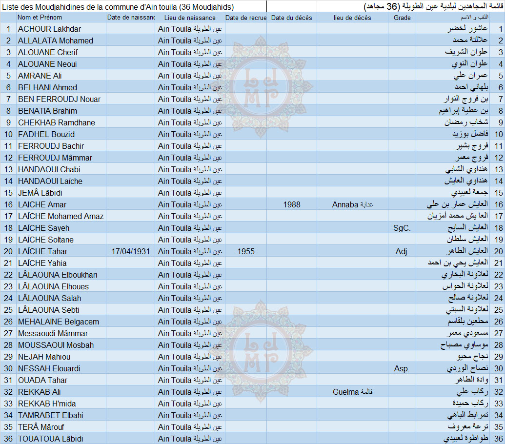 ملاحظة: تم أسر جميع المجاهدين من قبل الجيش الاستعماري باستثناء وادة الطاهر و بن فروج النوار |